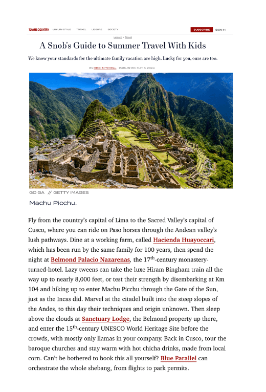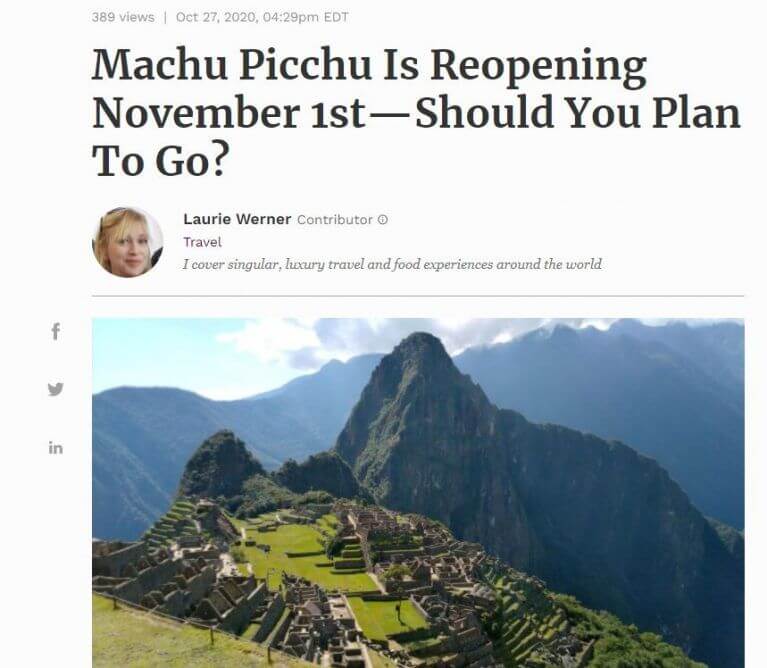 Visitors need to plan well in advance, he says, so the necessary tickets and permits can be secured. And waiting a few months and then following the protocols will be rewarding. “It will be a privilege to be able to enjoy UNESCO World Heritage sites such as Machu Picchu as it was pre-pandemic but without the crowds,” he says. Exactly as UNESCO prefers.” – Laurie Werner for Forbes Magazine